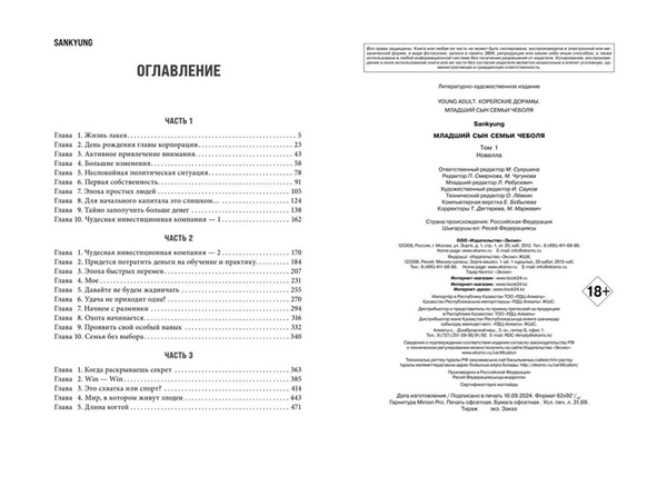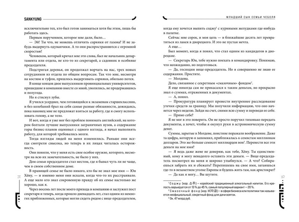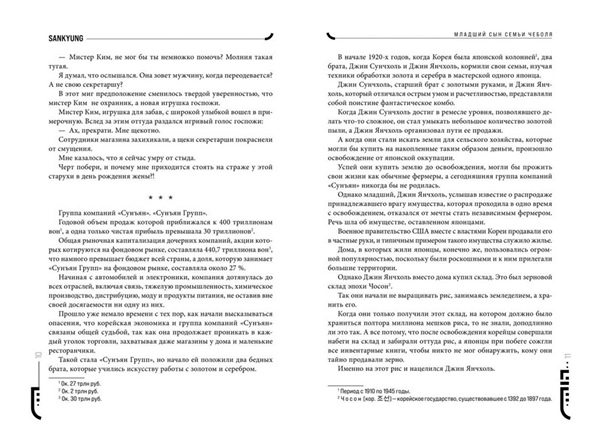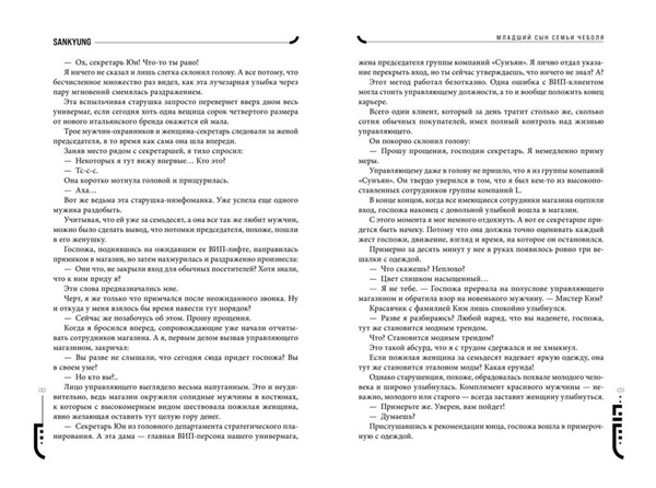 Популярная новелла «Младший сын семьи чеболя», которая легла в основу одноименной корейской дорамы, имевшей невероятный успех.Одержимый местью Юн Хёну пытается завоевать доверие основателя влиятельной корпорации Сунъян, чтобы сокрушить бизнес семьи, которая его предала.Юн Хёну посвятил тринадцать лет усердной работе на крупную корпорацию Сунъян. Он выполнял любые поручения, никогда не отказывал и не задавал лишних вопросов. Юн Хёну думал, что заслужил доверие компании, пока кто-то из семьи Сунъян не приказал его убить.Когда Юн Хёну был готов встретить смерть, он внезапно очнулся в теле младшего внука основателя корпорации. Теперь он Джин Доджун, а за окном 1987 год. Юн Хёну решает воспользоваться представившимся ему шансом и отомстить, завладев компанией Сунъян. Уже зная всю историю, Джин Доджун становится советником дедушки, пока члены семьи плетут интриги друг против друга. И только холодный расчет поможет победить в нечестной игре, где на кону огромные деньги и власть. Юный внук, который не может претендовать на наследство, но способен стать богаче всех своих родственников благодаря знаниям, накопленным в прошлой жизни.Чеболи — крупные южнокорейские корпорации, находящиеся в собственности одной семьи.Новелла способна увлечь каждого! Полное погружение в историю с завораживающим антуражем периода с 1987-го до современности, множество отсылок к реальным личностям и событиям. Интрига держит в напряжении до самого конца.Софттач суперобложка и обложка на мелованной бумаге, на форзацах родословная семьи.Внутри книги вас ждет блокнот.