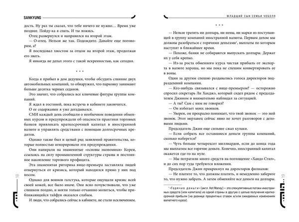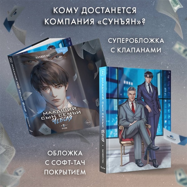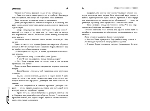 Второй том популярной новеллы «Младший сын семьи чеболя», которая легла в основу одноименной корейской дорамы, имевшей невероятный успех. Доджун развивает кинокомпанию своего отца и планирует перехитрить безжалостного, сурового и жадного до денег основателя Джин Янчхоля. Никто не ожидал, что финансовый кризис обрушится на Корею, но лишь Доджун знает, как его избежать. Младший чеболь использует знания из прошлой жизни, помогая спасти «Сунъян Групп» и предлагает заполучить доллары, чтобы подготовиться к валютной катастрофе. Благодаря этому внук заслужил доверие дедушки, основателя Джин Янчхоля, и теперь готовится нанести новый удар, в надежде стать преемником председателя. Доджун намерен поглотить ведущую строительную компанию «Тэа Констракшен» и в дальнейшем дать ей имя «Сунъян», чтобы заработать миллиарды. Тем временем чеболь сближается с одногруппницей Со Минён, которая намерена стать прокурором и бороться с коррупцией, однако она еще не догадывается, на кого впоследствии ей придется направить свои стрелы. Чеболи — крупные южнокорейские корпорации, находящиеся в собственности одной семьи. В новелле вы найдете множество отсылок к реальным личностям, событиям, компаниям, кинопроектам и музыкальным группам. Шикарное оформление с софттач суперобложкой российской художницы.