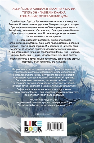 «Вторая книга цикла о злоключениях Луция — это редкое, упоительное сочетание драматургической дисциплины и эмоционального хаоса. Внутренняя механика истории превращает фэнтези в мощный политический триллер. Он удерживает внимание, разжигает любопытство и поражает логикой неожиданных сюжетных решений, которые автор исполняет с исключительным изяществом. Софье удалось написать не просто продолжение "Мертвых земель Эдеса" — она написала доказательство того, что янг эдалт может быть взрослым». — Мария Невретдинова, нарративный технолог группы сценарного отбора Showtime Networks, автор канала grafoman_ka