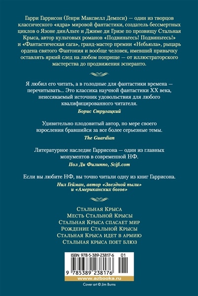 Цикл Гарри Гаррисона о Джиме ди Гризе, прозванном Стальной Крысой, по праву считается одним из лучших в творчестве прославленного фантаста. Герой цикла, великий плут и мошенник, умеет выходить сухим из воды практически в любой ситуации, какой бы безнадежной она ни показалась вначале, — и в любом уголке Галактики, куда бы его ни забрасывала судьба. Но чтобы из неотесанного паренька с забытой богом планеты сделаться супергероем, которому все по силам, нужно пройти тысяча и одно испытание. Послужить в армии с ее бездумными муштрой и шагистикой, поучаствовать в межзвездных баталиях, залезть в шкуру жуткого инопланетного монстра, ради иноземного артефакта попытать счастья на планете, куда ссылают преступников... Всякий ли на такое способен? Нет, конечно! Только Стальная Крыса, Джим ди Гриз, человек из нержавеющей стали. В книгу входят первые шесть романов цикла.