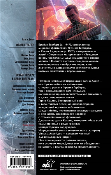 Истории нескольких персонажей саги о Дюне — как горячо любимых читателями с первого романа Фрэнка Герберта, так и появлявшихся там ненадолго, но успевших привлечь читательское внимание, и даже совершенно новых.Гарни Холлик, бесстрашный воин и талантливый певец, одинаково хорошо владеющий оружием и бализетом.Шадут Мейпс, пережившая ужасную трагедию и всю жизнь сражавшаяся наравне с отважнейшими из фрименов.Джопати из дома Колона, которого гибель всей семьи привела в ряды грозных императорских сардукаров.И преданный своему венценосному сюзерену Уильям Атрейдес — слишком честный для придворных интриг.Они принадлежат к разным эпохам, но в суровом мире Дюны всех их объединяет ненависть к врагам и жажда справедливости.