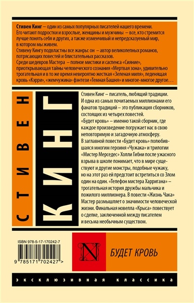 Стивен Кинг — писатель, любящий традиции. И одна из самых почитаемых миллионами его фанатов традиций — это публикация сборников, состоящих из четырех повестей. "Будет кровь" — именно такой сборник, где каждое произведение погружает нас в свою неповторимую и загадочную атмосферу. В заглавной повести "Будет кровь" полюбившаяся многим героиня "Чужака" и трилогии "Мистер Мерседес" Холли Гибни после ужасного взрыва в школе понимает, что в мире существуют и другие монстры, подобные чужаку, но на этот раз ей предстоит встретиться со Злом один на один. "Телефон мистера Харригана" — трогательная история дружбы мальчика и пожилого миллионера. В повести "Жизнь Чака" Мастер размышляет о значимости человеческой жизни. Финальная новелла "Крыса" повествует о сделке, заключенной между писателем и весьма необычным существом.