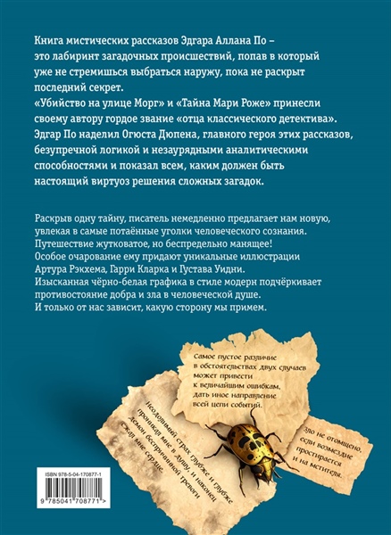 Наполненные загадками и мистикой новеллы Эдгара Аллана По послужили основой для развития двух популярнейших жанров: классического детектива и психологической прозы. В книгу вошли 14 рассказов, в том числе "Убийство на улице Морг", "Тайна Мари Роже", "Золотой жук" и другие. Чёрно-белые иллюстрации в стиле модерн.