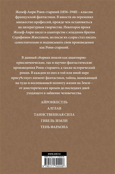 В данный сборник вошли как авантюрно-приключенческие, так и научно-фантастические произведения Рони-старшего, а также исторический роман. В каждом из них в той или иной мере присутствует элемент фантастики, тайны, намекающей на чудо и воспевающей полноту жизни на Земле – от доисторических времен до последних дней уходящего в забвение человечества.