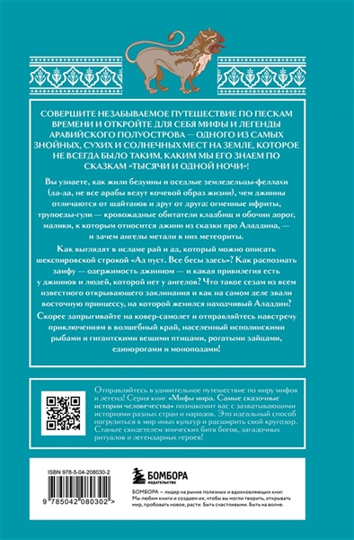 Страны Персидского залива давно стали новой Америкой, куда отправляются за новыми горизонтами и реализацией самых смелых бизнес-идей. Но что мы знаем об истории и культуре этого знойного региона, помимо всемирно известного сборника сказок «Тысяча и одна ночь»? Эта уникальная книга познакомит вас с основой арабской нематериальной культуры — пестрой и многослойной мифологией Аравийского полуострова, ее витиеватым развитием и влиянием на нее соседних культур, ее основными фигурами и ключевыми сюжетами. Вы узнаете, как жили древние арабы — кочевники-бедуины и оседлые земледельцы-феллахи — чем различались их доисламские пантеоны и каких удивительных существ, по легендам, можно было встретить в пустынях и оазисах Древней Аравии. На каком расстоянии друг от друга находятся семь небес и кто на них живет? Из чего сделаны шайтаны и кто ответственен за приливы и отливы, землетрясения и штормы? Сколько существует разновидностей джиннов, в чем заключается их коварство и как распознать заифу — одержимость джинном? Это и многое другое вы узнаете из этой книги, а цветные и черно-белые иллюстрации дополнят сказочное путешествие по страницам арабских преданий. В пути вам встретятся бог судьбы Хубал, идол которого когда-то стоял в Мекке, хранительница могильного покоя Манат и покровитель караванов аль-Каум, исполинская рыба Бахамут, держащая на себе весь мир, и гигантская птица Рух, кормящая своих птенцов слонами и носорогами, Аладдин и Синдбад-мореход, а еще загадочное племя моноподов наснас и фантастические химеры, которыми средневековые легенды населяли Аравию… Вооружитесь хитростью и смекалкой, как герои сказок мудрой Шахерезады, и отправьтесь в свое собственное большое приключение! Серия книг «Мифы мира. Самые сказочные истории человечества» познакомит вас с захватывающими историями разных стран и народов. Это идеальный способ погрузиться в мир иных культур и расширить свой кругозор. Станьте свидетелем эпических битв богов, загадочных ритуалов и легендарных героев!
