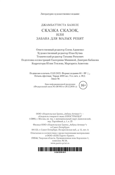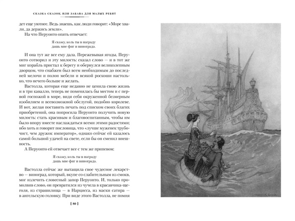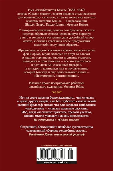 Имя Джамбаттисты Базиле (1583–1632), автора «Сказки сказок», совсем недавно стало известно русскоязычному читателю, и тем не менее ему неплохо знакомы истории Базиле — в переложении Шарля Перро, Карло Гоцци и братьев Гримм. У автора-неаполитанца, однако, эти бродячие сюжеты нередко обретают совсем неожиданную окраску: у него и золушка в состоянии дать достойный отпор мачехе, и спящая красавица после пробуждения ведет себя далеко не лучшим образом...Фривольные и даже жестокие сюжеты, вмешательство фей и орков, герои, которые не лезут за словом в карман, горячность юности и уныние старости, назидания и приключения — все это вместилось в пятидневный сказочный марафон, в пятьдесят занимательных и поучительных историй (отсюда и еще одно название книги — «Пентамерон», «пятидневник»).Издание проиллюстрировано работами английского художника Уорвика Гобла.