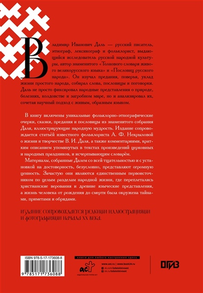 Владимир Иванович Даль — русский писатель, этнограф, лексикограф и фольклорист, выдающийся исследователь русской народной культуры, автор знаменитого "Толкового словаря живого великорусского языка" и "Пословиц русского народа". Он изучал предания, поверья, уклад жизни простого народа, собирал слова, пословицы и поговорки. Даль не просто фиксировал народные представления о природе, болезнях, колдовстве и загробном мире, но и анализировал их, сочетая научный подход с живым, образным языком. В книгу включены уникальные фольклорно-этнографические очерки, сказки, предания и пословицы из знаменитого собрания Даля, иллюстрирующие народную мудрость. Издание сопровождается статьёй известного фольклориста А. Ф. Некрыловой о жизни и творчестве В. И. Даля, а также комментариями, кратким описанием упомянутых в текстах произведений церковных и народных праздников, и исчерпывающим словарём. Материалы, собранные Далем со всей тщательностью и с установкой на достоверность, безусловно, представляют огромную ценность. Зачастую они являются единственным первоисточником по целым разделам народной жизни, где переплетались христианские верования и древние языческие представления, а жизнь человека от рождения до смерти была окружена тайнами, приметами и обрядами. Издание сопровождается редкими иллюстрациями и фотографиями начала XX века.