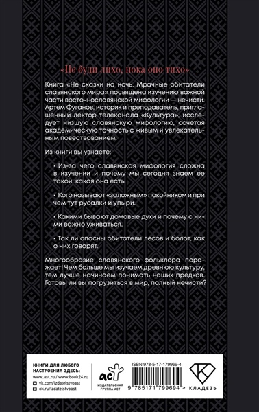Книга "Не сказки на ночь. Мрачные обитатели славянского мира" посвящена изучению важной части восточнославянской мифологии — нечисти. Артем Фуганов, историк и преподаватель, приглашенный лектор телеканала "Культура", исследует низшую славянскую мифологию, сочетая академическую точность с живым и увлекательным повествованием. Из книги вы узнаете: • Из-за чего славянская мифология сложна в изучении, и почему мы сегодня знаем ее такой, какая она есть. • Кого называют "заложным" покойником и при чем тут русалки и упыри. • Какими бывают домовые духи и почему с ними важно уживаться. • Так ли опасны обитатели лесов и болот, как о них говорят. Многообразие славянского фольклора поражает!Чем больше мы изучаем древнюю культуру, тем лучше начинаем понимать наших предков. Готовы ли вы погрузиться в мир, полный нечисти?