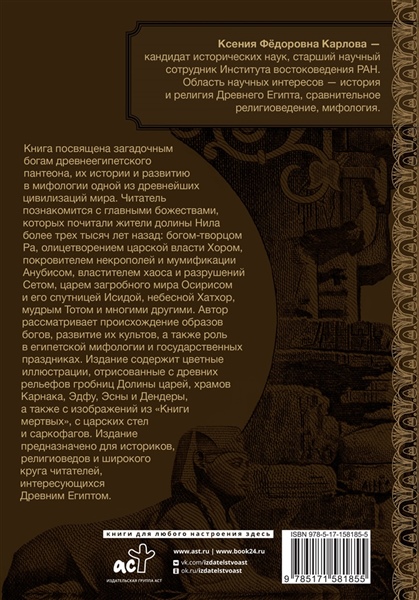 Книга посвящена загадочным богам древнеегипетского пантеона, их истории и развитию в мифологии одной из древнейших цивилизаций мира. Читатель познакомится с главными божествами, которых почитали жители долины Нила более трех тысяч лет назад: богом-творцом Ра, олицетворением царской власти Хором, покровителем некрополей и мумификации Анубисом, властителем хаоса и разрушений Сетом, царем загробного мира Осирисом и его спутницей Исидой, небесной Хатхор, мудрым Тотоми многими другими. Автор рассматривает происхождение образов богов, развитие их культов, а также роль в египетской мифологии и государственных праздниках. Издание содержит цветные иллюстра-ции, отрисованные с древних рельефов гробниц Долины царей, храмов Карнака, Эдфу, Эсны и Дендеры, а также с изображений из "Книги мертвых", с царских стел и саркофагов. Издание предназначенодля историков, религиоведов и широкого круга читателей, интересующихся Древним Египтом.