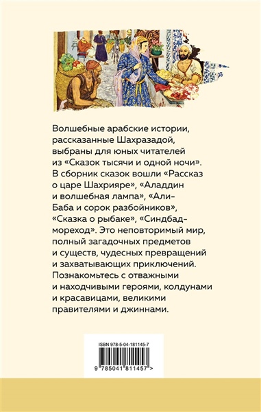 Волшебные арабские истории, рассказанные Шахразадой, выбранны для юных читателей из "Сказок 1001 ночи". В сборник сказок вошли: "Рассказ о царе Шахрияре", "Аладдин и волшебная лампа", "Али-Баба и сорок разбойников", "Сказка о рыбаке", "Синдбад-Мореход". Познакомьтесь с Синдбадом-мореходом, Аладдином, Али-Бабой, колдунами, красавицами и джиннами, великими правителями, волшебными предметами, чудесными превращениями и многим другим.
