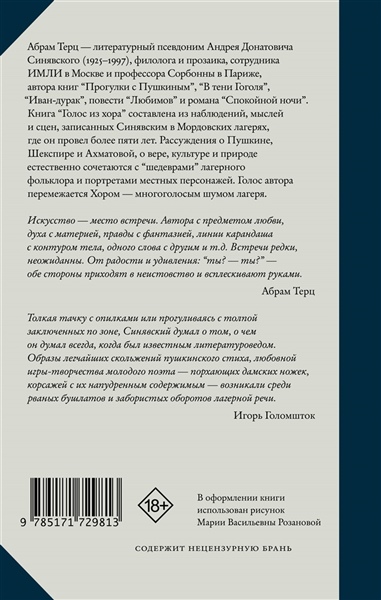 Книга “Голос из хора” составлена из наблюдений, мыслей и сцен, записанных Синявским в Мордовских лагерях, где он провел более пяти лет. Рассуждения о Пушкине, Шекспире и Ахматовой, о вере, культуре и природе естественно сочетаются с “шедеврами” лагерного фольклора и портретами местных персонажей. Голос автора перемежается Хором — многоголосым шумом лагеря.