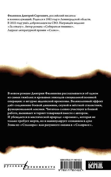 В новом романе Дмитрия Филиппова рассказывается об одном из самых тяжёлых и кровавых эпизодов специальной военной операции: о штурме авдеевской промзоны. Великолепный эффект даёт соединение боевой динамики, скупой и жёсткой стилистики, функцио- нальной лексики. Читатель словно участвует в боевой работе, выживает и теряет товарищей вместе с автором. И убеждается в мистической природе "промки", которая не только требует жертв, но и манипулирует сознанием в духе Зоны из "Сталкера" или разумного океана в "Солярисе".