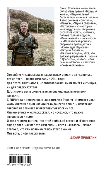 Эту войну мне довелось предсказать и описать за несколько лет до того, как она началась в 2014 году.Для этого, признаться, не потребовалась ни развитая интуиция, ни дар предсказателя.Достаточно было смотреть на происходящее открытыми глазами.С 2014 года я наверняка знал о том, что Россия не сможет избежать участия в украинской гражданской войне, и неустанно говорил об этом все те пресловутые восемь лет.Что конфликт — не рассосётся, не исчезнет, что нужно готовиться к нему.Я знал многих фигурантов этой войны, её героев и её негодяев ещё до того, как всё это началось. А когда началось — узнал столько, что сам порой пугаюсь этого знания.Мне есть, о чём рассказать.Захар Прилепин