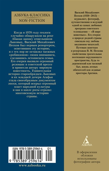 Василий Михайлович Песков (1930–2013) — журналист, фотограф, путешественник и ведущий одной из самых любимых программ советского телевидения — «В мире животных». Его очерки о природе родной страны снискали ему любовь миллионов читателей. Путевым заметкам и репортажам В. М. Пескова свойственна трогательная поэтизация окружающего пространства, будь то деревенский или таежный быт, жизнь лесных обитателей или ледяные просторы Арктики. Когда в 1978 году геологи случайно обнаружили на реке Абакан заимку отшельников Лыковых, Василий Михайлович Песков был первым репортером, осветившим эту историю, и с тех пор не оставлял таежных «робинзонов» своим вниманием, сделавшись летописцем семьи. Его очерки вызвали огромный резонанс в советской прессе и принесли автору мировую известность. Удивительная история старообрядцев Лыковых и их младшей дочери Агафьи стала своеобразным документом эпохи, который вскрыл огромный пласт народнойистории страны.