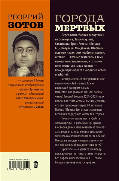 Перед вами сборник репортажей из Освенцима, Заксенхаузена, Саласпилса, Гросс-Розена, "Киндер КЦ", Потулице, Майданека, Озаричей и других нацистских "фабрик смерти". А также — личные разговоры с теми немногими свидетелями, кто чудом смог вернуться назад живым — пройдя через ворота с надписью Arbeit macht frei.