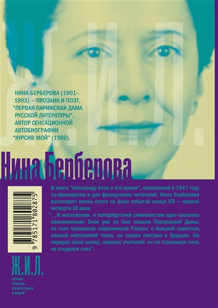 Нина Берберова (1901–1993) — прозаик и поэт, "первая парижская дама русской литературы", автор сенсационной автобиографии "Курсив мой" (1969). В книге "Александр Блок и его время", написанной в 1947 году по-французски и для французских читателей Нина Берберова воссоздает жизнь поэта на фоне событий конца XIX – пеpвой четвеpти XX века. "…И московским, и петербургским символистам одно казалось несомненным: Блок уже не был певцом Прекрасной Дамы; он стал человеком современной России; с больной совестью, полный неутолимой тоски, он трезво смотрел в будущее. Он перерос свою школу, перерос учителей: он не страшился слов, не стыдился слез".