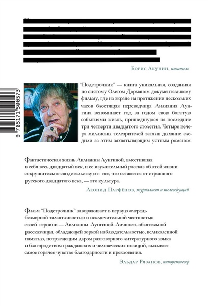 Лилианна Лунгина — прославленный мастер литературного перевода. Благодаря ей русские читатели узнали “Малыша и Карлсона” и “Пеппи Длинныйчулок” Астрид Линдгрен, романы Гамсуна, Стриндберга, Бёлля, Сименона, Виана, Ажара. В детстве она жила во Франции, Палестине, Германии, а в начале тридцатых годов тринадцатилетней девочкой вернулась на родину, в СССР.Жизнь этой удивительной женщины глубоко выразила двадцатый век. В ее захватывающем устном романе соединились хроника драматической эпохи и исповедальный рассказ о жизни души. М. Цветаева, В. Некрасов, Д. Самойлов, А. Твардовский, А. Солженицын, В. Шаламов, Е. Евтушенко, Н. Хрущев, А. Синявский, И. Бродский, А. Линдгрен — вот лишь некоторые, самые известные герои ее повествования, далекие и близкие спутники ее жизни, которую она согласилась рассказать перед камерой в документальном фильме Олега Дормана.