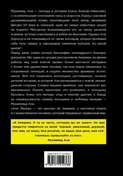 Джонатан Эйг, один из лучших рассказчиков Америки, во время работы над этой книгой провел более шестисот интервью с более чем двумястами человек, так или иначе связанных со спортивной легендой, и поднял множество архивных источников. Всё это позволило воссоздать достоверную, полную деталей историю, в которой Али раскрывается с новой, неожиданной стороны. Словно машина времени она перенесет вас максимально близко, насколько это возможно, к молодому Кассиусу Клею, его матери, отцу и многим другим; к борцу за справедливость, кумиру молодежи и любимцу женщин — Мухаммеду Али.