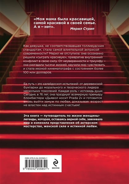 Как девушка, не соответствовавшая голливудским стандартам, стала самой влиятельной актрисой современности? Мерил не отступила: она осознанно решила "сыграть красивую", превратив внутренний конфликт в свою силу. От неуверенности к триумфу – она разгадала тысячи жизней, научила мир чувствовать и стала иконой кинематографа с состоянием более 100 млн долларов. Ее путь – это калейдоскоп испытаний: от деревенской бунтарки до морального и творческого лидера нескольких поколений. Каждая роль – исповедь души. Сегодня, в 76 лет, она празднует всемирную премьеру блокбастера "Дьявол носит Prada 2" и готовится вновь выйти замуж по любви, доказывая: возраст не властен над истинным счастьем! Эта книга — путеводитель по жизни женщины-легенды, которая, оставаясь верной себе, завоевала мир и изменила представления об актерском мастерстве, женской силе и истинной любви.