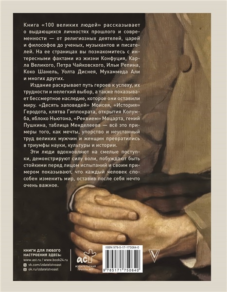 Книга "100 великих людей" рассказывает о выдающихся личностях прошлого и современности — от религиозных деятелей, царей и философов до ученых, музыкантов и писателей. На ее страницах вы познакомитесь с интересными фактами из жизни Конфуция, Карла Великого, Петра Чайковского, Ильи Репина, Коко Шанель, Уолта Диснея, Мухаммеда Али и многих других.