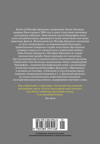 Книга об Иосифе Бродском, написанная Львом Лосевым, впервые была издана в 2006 году и сразу стала очень значимым культурным событием. Невозможно свести биографию поэта столь исключительного дарования к некой сумме более или менее известных фактов. Жизненный путь Иосифа Бродского неотделим от пути литературного, их взаимовлияние бесспорно, драматические повороты в судьбе поэта были обусловлены в первую очередь его стремлением к творческой свободе. Льва Лосева связывала с Иосифом Бродским не только многолетняя дружба: Лосев переводил его эссеистику, был исследователем и комментатором стихотворного наследия. Своей книге Лев Лосев дал подзаголовок «Опыт литературной биографии», соединив биографическую канву с различными аспектами творческой биографии Бродского, обратившись к истокам его поэтики, этическому и эстетическому кредо, влиянию литературной традиции и т. д. Бродский предстает не только исключительно мужественным человеком, но и оригинальным мыслителем, выдающимся мастером слова. Издание снабжено вклейкой с иллюстрациями.