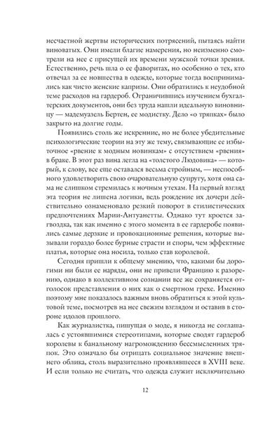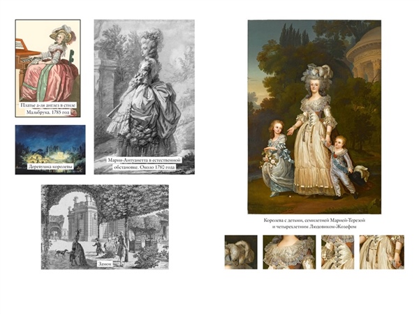 «Сначала ее с радостью встречали в Тюильри парижанки, выпрашивавшие цветы и ленты с ее шляпы, пока парижане удивлялись ее достоинству, простоте и заботе о детях. Затем ее освистывали, втаптывали в грязь, лишали человеческого облика — так продолжалось до самого последнего акта трагедии, в котором ее смерть превратили в представление, увековечив ее образ в розово-черных тонах… Поскольку “маленькая история” платьев Марии-Антуанетты тесно связана с ее личностью и неотделима от “большой истории» Франции, я приглашаю вас пройти с ней путь от Вены до гильотины, следуя за изменениями ее гардероба» (Сильви Ле Бра-Шово).