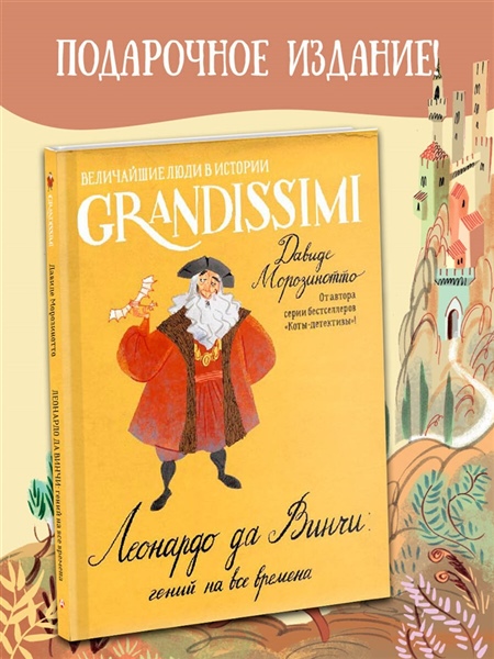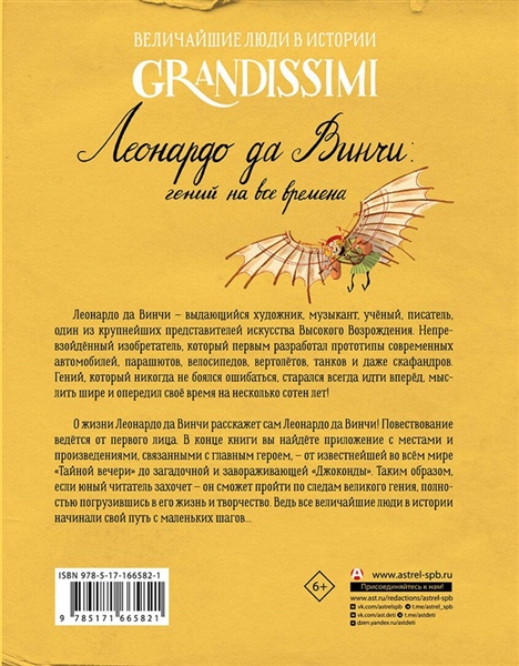 Леонардо да Винчи — выдающийся художник, музыкант, учёный, писатель, один из крупнейших представителей искусства Высокого Возрождения. Непревзойдённый изобретатель, который первым разработал прототипы современных автомобилей, парашютов, велосипедов, вертолётов, танков и даже скафандров. Гений, который никогда не боялся ошибаться, старался всегда идти вперёд, мыслить шире и опередил своё время на несколько сотен лет!
