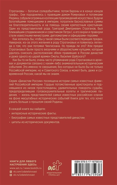Строгановы — богатые соледобытчики, потом бароны и в конце концов графы… Они породнились с правящим домом Романовых и потомками Рюрика, собрали огромные коллекции произведений искусства и, будучи богатейшими помещиками в империи, потратили баснословные суммы на благотворительность и на помощь своим крепостным крестьянам. Один из представителей рода, Григорий Дмитриевич Строганов, был ближайшим сподвижником и советчиком Петра I, а его внуки и правнуки стали известными министрами, дипломатами и офицерами-героями. Как хотелось бы, чтобы у такой семьи были соответствующие предки. Наверное, из-за этого желания в роду Строгановых и появилась легенда о том, что они потомки Чингисхана. Но правда ли это? Или предки Строгановых были просто везучими и оборотистыми купцами, которым удалось снискать расположение обеих правивших в России династий и даже одного из царей времен Смуты Василия Шуйского? Как бы то ни было, очень часто упоминание рода Строгановых в архивах и документах связано с каким-либо знаменательным историческим событием. Это именно те свершения, без которых не было бы не только Российской империи, но и Советского Союза, а может быть, даже и современной России, какой мы ее знаем.