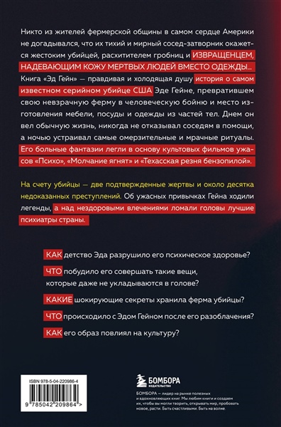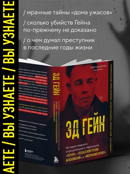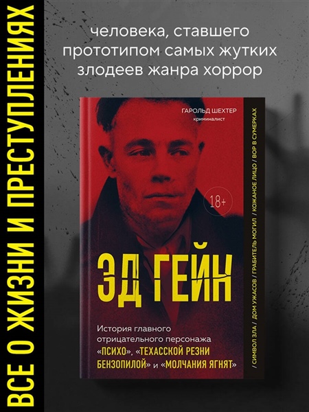 Шел 1957 год. Для своих соседей из фермерской общины в Америке Эд Гейн был непримечательным, тихим холостяком с кривой улыбкой и странным юмором. Никто не знал, что уже 10 лет он живет в своем тайном мире жестоких убийств и немыслимых извращений, и вот настал момент, когда раскрылась вся правда о его зверствах… Автор Гарольд Шехтер — американский писатель-криминалист, почетный профессор в колледже Куинс, специализирующийся на преступлениях, в частности серийных убийствах 19-го и 20-го веков. Используя газетные вырезки и судебные записи, он предоставляет подробную документацию каждого описываемого случая, при этом создавая захватывающие повествования и полностью проработанных персонажей. Его работы публиковались в таких изданиях, как The New York Times, The Wall Street Journal, Los Angeles Times и многих других. В книге «Эд Гейн» Гарольд Шехтер рассказывает историю серийного убийцы, чье имя прогремело на весь мир. Эд Гейн известен как «мясник из Плейнфилда». Он был расхитителем гробниц и извращенцем, который превратил свою ферму в мастерскую по изготовлению мебели, посуды и одежды из частей человеческих тел. - Как детство Эда разрушило его психическое здоровье? - Что побудило его совершать такие вещи, которые даже не укладываются в голове? - Какие шокирующие секреты хранила ферма убийцы? - Что происходило с Эдом Гейном после его разоблачения? - Как его образ повлиял на культуру? В этой книге вы найдете ответы на эти вопросы и окунетесь в страшную, но захватывающую дух историю.