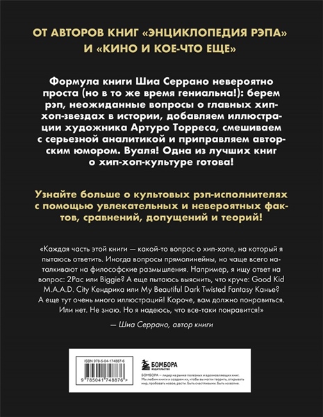 Впервые на русском! Книга от автора бестселлеров «Энциклопедия рэпа» и «Кино и кое-что еще». Шиа Серрано объединил все лучшее, что было в его предыдущих книгах. Формула проста: берем рэп, неожиданные вопросы о главных хип-хоп звездах в истории, добавляем иллюстрации художника Артуро Торреса, смешиваем с серьезной аналитикой и приправляем авторским юмором. Вуаля! Одна из лучших книг о культуре хип-хопа готова.