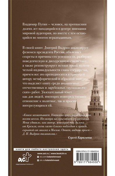 Владимир Путин — человек, на протяжении долгих лет находящийся в центре внимания мировой аудитории, но вместе с тем остающийся во многом неразгаданным. В своей книге Дмитрий Выдрин анализирует феномен президен- та России, объясняет секреты и причины его успешности, разбирает поведенческую и дискурсивную стилистику, а также реконструирует истоки яркой политической индивидуальности главы государства, причем все это преподносится в присущей автору метафорической и образной манере, что выделяет книгу среди аналогичных отечественных и зарубежных "путиноведческих" работ. Увлекательный текст как для людей, имеющих непосредственное отношение к политике, так и просто интересующихся ей.