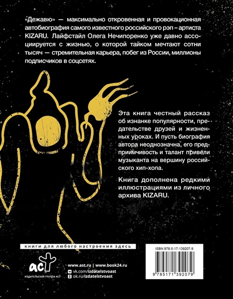 "Дежавю" - максимально откровенная и провокационная автобиография самого известного российского рэп – артиста KIZARU. Лайфстайл Олега Нечипоренко уже давно ассоциируется с жизнью, о которой тайком мечтают сотни тысяч — стремительная карьера, побег из России, миллионы подписчиков в соцсетях. Эта книга честный рассказ об изнанке популярности, предательстве друзей и жизненных уроках. И пусть биография автора неоднозначна, его предприимчивость и талант привели музыканта на вершину российского хип-хопа. Книга дополнена редкими иллюстрациями из личного архива KIZARU.