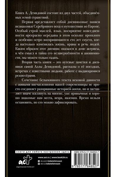 В первой части — дневник рассказ незнакомки Серебряного века о путешествии по Европе. Особый строй мыслей, язык, восприятие повседневности прекрасно зафиксированы в этом осколке прошлого и особенно остро воспринимаются сто лет спустя, когда настолько изменилась жизнь, нравы, речь и восприятие мира. Когда, почему, зачем этот дневник оказался в доме актрисы, в чем смысл и тайна его незавершенности ианонимности — мы можем только гадать.