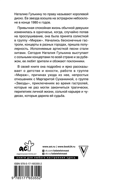 Наталию Гулькину по праву называют королевой диско. Ее звезда взошла на эстрадном небосклоне в конце 1980-х годов. Привычная спокойная жизнь обычной девушки изменилась в одночасье, когда, случайно попав на прослушивание, она была принята солисткой в группу "Мираж". Начались бесконечные гастроли в разных городах, пришла популярность. Исполняемые артисткой песни стали хитами. Сегодня Наталия Гулькина выступает с сольными концертами по всей стране и за рубежом, ее любят зрители и обожают поклонники. В своей книге она подробно и ярко рассказывает о детстве и юности,работе в группе "Мираж", причинах ухода из нее, непростых отношениях с Маргаритой Суханкиной, о группе "Звезды", приключениях во время гастролей, которые не раз могли закончиться трагически, перипетиях личной жизни, сольной карьере и чудесах, которые дарила ей судьба.
