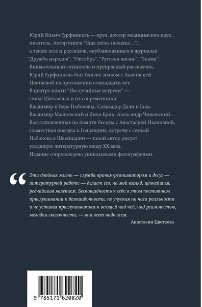 Юрий Ильич Гурфинкель — врач, доктор медицинских наук, писатель. Автор книги “Еще легка походка…”, а также эссе и рассказов, опубликованных в журналах “Дружба народов”, “Октябрь”, “Русская жизнь”, “Знамя”. Внимательный слушатель и прекрасный рассказчик, Юрий Гурфинкель был близко знаком с Анастасией Цветаевой на протяжении семнадцати лет. В центре книги “Неслучайные встречи” — семья Цветаевых и их современники: Владимир и Вера Набоковы, Сальвадор Дали и Гала, Владимир Маяковский и Лиля Брик, Александр Чижевский… Восстановленные по памяти беседы с Анастасией Ивановной, совместная поездка в Голландию, встречи с семьей Набокова в Швейцарии — такой автор рисует уходящую литературную эпоху ХХ века. Издание сопровождено уникальными фотографиями. “Эта двойная жизнь — служба врачом-реаниматором и досуг — литературной работе — делает его, на мой взгляд, ценнейшим, редчайшим явлением. Беспощадность к себе в этом постоянном прислушивании к безошибочности, не упуская ни часа реальности и не уставая прислушиваться к веющей над ней, над реальностью, мелодии сказочности, — она веет надо всем” (Анастасия Цветаева).
