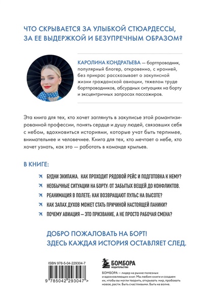 Забудьте всё, что вы знали о полётах. Автор Каролина Кондратьева, прошедшая путь от стажёра до старшего бортпроводника, забирает вас с собой в рейс, который перевернёт ваше представление о небе.