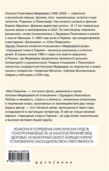 "Мой Лимонов" — книга прозы, дневников и писем Наталии Медведевой об отношениях с Эдуардом Лимоновым. Любовь и ненависть. Страсть и нежность. Жизненные катаклизмы и творческие искры. Высекаемые от взаимодействия двух незаурядных фигур, — этот пёстрый набор, пропущенный через годы, складывается в настоящую литературу. В ней не только женский вариант "Укрощения тигра в Париже", но куда более значительная и высокая мелодия общей судьбы.