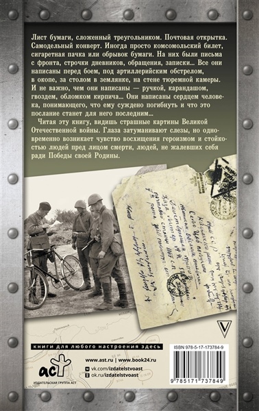 Лист бумаги, сложенный треугольником. Почтовая открытка. Самодельный конверт. Иногда просто комсомольский билет, сигаретная пачка или обрывок бумаги. На них были письма с фронта, строчки дневников, обращения, записки… Они написаны перед боем, под артиллерийским обстрелом, в окопе, за столом в землянке, на стене тюремной камеры... И не важно, чем– ручкой, карандашом, гвоздем, обломком кирпича… Они написаны сердцем человека, понимающего, что он можетв любой момент погибнуть и что это послание, возможно, станет последним, единственным криком души, обращенным к самым дорогим и любимым… Читая эту книгу, видишь страшные картины Великой Отечественной войны. Глаза затуманивают слезы, но одновременно возникает чувство восхищения героизмом и стойкостью людей пред лицом смерти, людей, не жалевших себя ради Победы своей Родины.