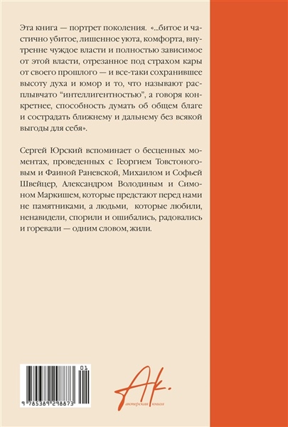 Сергей Юрский вспоминает о бесценных моментах, проведенных с Георгием Товстоноговым и Фаиной Раневской, Михаилом и Софьей Швейцерами, Александром Володиным и Симоном Маркишем, которые предстают перед нами не памятниками, а людьми,которые любили, ненавидели, спорили и ошибались, радовались и горевали — одним словом, жили.