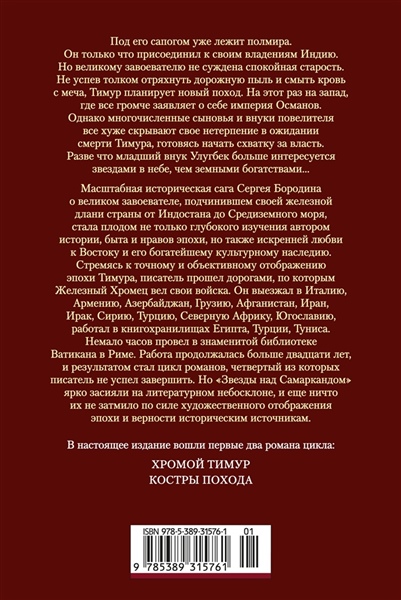 Под его сапогом уже лежит полмира. Он только что присоединил к своим владениям Индию. Но великому завоевателю не суждена спокойная старость. Не успев толком отряхнуть дорожную пыль и смыть кровь с меча, Тимур планирует новый поход. На этот раз на запад, где все громче заявляет о себе империя Османов. Однако многочисленные сыновья и внуки повелителя все хуже скрывают свое нетерпение в ожидании смерти Тимура, готовясь начать схватку за власть. Разве что младший внук Улугбек больше интересуется звездами в небе, чем земными богатствами... Масштабная историческая сага Сергея Бородина о великом завоевателе, подчинившем своей железной длани страны от Индостана до Средиземного моря, стала плодом не только глубокого изучения автором истории, быта и нравов эпохи, но также искренней любви к Востоку и его богатейшему культурному наследию. Стремясь к точному и объективному отображению эпохи Тимура, писатель прошел дорогами, по которым Железный Хромец вел свои войска. Он выезжал в Италию, Армению, Азербайджан, Грузию, Афганистан, Иран, Ирак, Сирию, Турцию, Северную Африку, Югославию, работал в книгохранилищах Египта, Турции, Туниса. Немало часов провел в знаменитой библиотеке Ватикана в Риме. Работа продолжалась больше двадцати лет, и результатом стал цикл романов, четвертый из которых писатель не успел завершить. Но «Звезды над Самаркандом» ярко засияли на литературном небосклоне, и еще ничто их не затмило по силе художественного отображения эпохи и верности историческим источникам. В настоящее издание вошли первые два романа цикла: «Хромой Тимур» и «Костры похода».