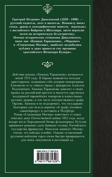 Действие романа "Княжна Тараканова" начинается зимой 1775 года. В Европе появляется молодая аристократка, назвавшая себя дочерью императрицы Елизаветы от ее тайного брака с фаворитом Алексеем Разумовским. Княжна Тараканова заявляет о своих правах на российский престол и пытается заручиться поддержкой европейских монархов и влиятельных русских дворян, в том числе могущественного графа Орлова. Княжна и не подозревает, что государыня Екатерина уже велела верному ей графу изловить "авантюрьеру" и доставить в Петербург. Роман "Сожженная Москва" повествует о самых тяжелых днях Отечественной войны 1812 года, когда вскоре после Бородинской битвы фельдмаршал Кутузов принимает решение сдать бывшую столицу Российского государства французам.Наполеон занимает Москву, считая, что победил в войне. Однако оставленный русскими войсками город очень быстро превращается для своих оккупантов в настоящий ад.