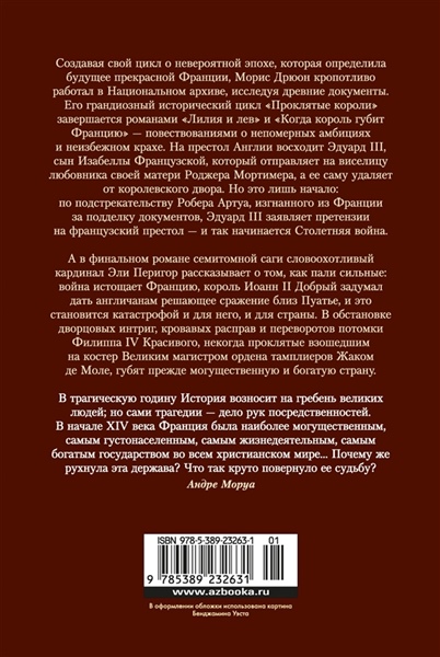 Создавая свой цикл о невероятной эпохе, которая определила будущее прекрасной Франции, Морис Дрюон кропотливо работал в Национальном архиве, исследуя древние документы. Его грандиозный исторический цикл «Проклятые короли» завершается романами «Лилия и лев» и «Когда король губит Францию» — повествованиями о непомерных амбициях и неизбежном крахе. На престол Англии восходит Эдуард III, сын Изабеллы Французской, который отправляет на виселицу любовника своей матери Роджера Мортимера, а ее саму удаляет от королевского двора. Но это лишь начало: по подстрекательству Робера Артуа, изгнанного из Франции за подделку документов, Эдуард III заявляет претензии на французский престол — и так начинается Столетняя война. А в финальном романе семитомной саги словоохотливый кардинал Эли Перигор рассказывает о том, как пали сильные: война истощает Францию, король Иоанн II Добрый задумал дать англичанам решающее сражение близ Пуатье, и это становится катастрофой и для него, и для страны. В обстановке дворцовых интриг, кровавых расправ и переворотов потомки Филиппа IV Красивого, некогда проклятые взошедшим на костер Великим магистром ордена тамплиеров Жаком де Моле, губят прежде могущественную и богатую страну.