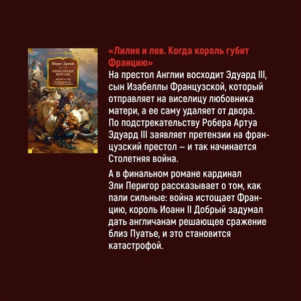 Мориса Дрюона читающая публика знает прежде всего по саге «Проклятые короли», открывшей мрачные тайны Средневековья. За каждым произведением цикла стояла кропотливая работа в Национальном архиве, изучение документов, написанных на архаичном французском или на латыни. Открыл эту серию исторических фресок роман «Железный король». Великий магистр ордена тамплиеров Жак де Моле, взойдя на костер 18 марта 1314 года,проклял своих палачей — папу Климента V, короля Филиппа Красивого, его советника Гийома де Ногаре и все их потомство до тринадцатого колена. Первый удар судьбы – обвинение невесток короля в неверности – не замедлил последовать. Но еще никто не знает, какие беды сулит будущее Железному королю…