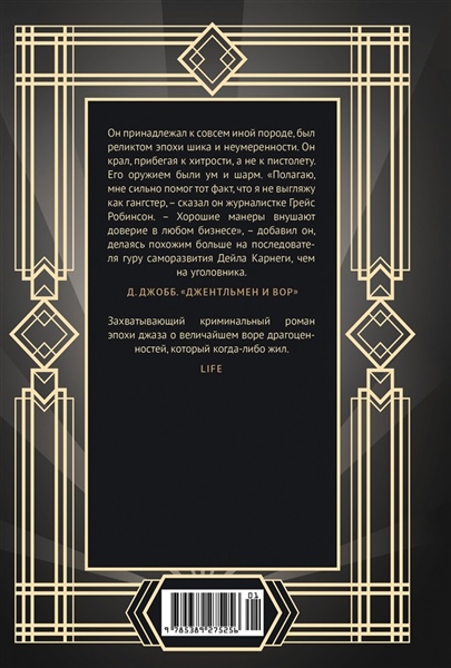 Захватывающий криминальный роман эпохи джаза об Артуре Барри, "величайшем воре драгоценностей, который когда-либо жил" (журнал Life). Он очаровал всех, от Рокфеллеров до членов королевской семьи, планируя и осуществляя самые дерзкие и прибыльные ограбления 1920-х годов. За семь лет Принц воров украл бриллиантов, жемчуга и драгоценных камней на общую сумму почти 60 миллионов долларов. Безупречно элегантный, невероятно обходительный, с изысканными манерами, он нравился всем, а ему нравились лишь драгоценности. А еще это история любви. Единственной любви на всю жизнь. Барри признался в десятках краж со взломом (и был главным подозреваемым во множестве других), чтобы защитить свою жену Анну Блейк. Приговоренный к большому сроку, он организовал побег из тюрьмы, когда Анна серьезно заболела, чтобы они могли провести вместе еще несколько лет, пусть это стоило ему семнадцати лет нового заключения.