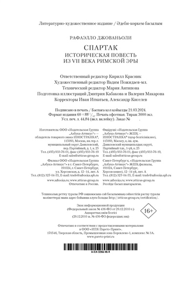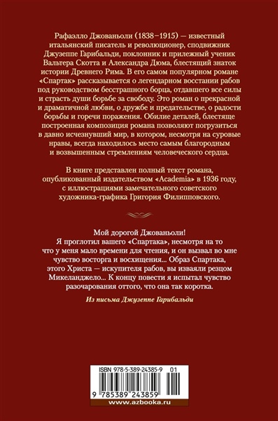 Рафаэлло Джованьоли (1838–1915) — известный итальянский писатель и революционер, сподвижник Джузеппе Гарибальди, поклонник и прилежный ученик Вальтера Скотта и Александра Дюма, блестящий знаток истории Древнего Рима. В его самом популярном романе «Спартак» рассказывается о легендарном восстании рабов под руководством бесстрашного борца, отдавшего все силы и страсть души борьбе за свободу. Это роман о прекрасной и драматичной любви, о дружбе и предательстве, о радости борьбы и горечи поражения. Обилие деталей, блестяще построенная композиция романа позволяют погрузиться в давно исчезнувший мир, в котором, несмотря на суровые нравы, всегда находилось место самым благородным и возвышенным стремлениям человеческого сердца. В книге представлен полный текст романа, опубликованный издательством «Academia» в 1936 году, с редкими иллюстрациями замечательного советского художника-графика Григория Филипповского.