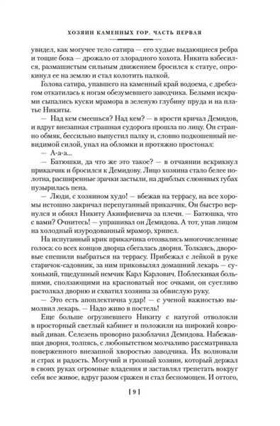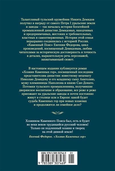 Талантливый тульский оружейник Никита Демидов получил в награду от самого Петра I уральские земли и заводы — так началась история богатейшей промышленной династии Демидовых, находчивых и предприимчивых, жестоких и требовательных, властных и самоотверженных. История этой семьи неразрывно соединилась с историей России. «Каменный Пояс» Евгения Федорова, цикл произведений, посвященный Демидовым, любим читателями за историческую достоверность и точность в деталях, выразительную речь персонажей, захватывающий сюжет. В настоящем издании публикуется роман «Хозяин Каменных гор», посвященный последним представителям династии: известному меценату Николаю Демидову и его младшему сыну Анатолию, мужу племянницы Наполеона и князю Сан-Донато. Потомки тульского промышленника, получившие дворянское воспитание и образование, все реже и реже приезжают на уральские заводы и почти постоянно живут в столице или в Европе: какой будет судьба Каменных гор при новых хозяевах и продолжится ли семейное дело?