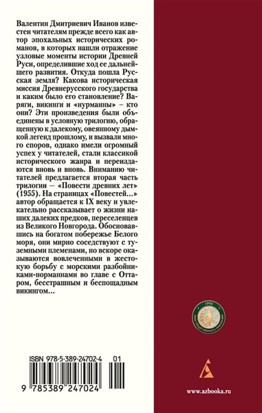 Валентин Дмитриевич Иванов известен читателям прежде всего как автор эпохальных исторических романов, в которых нашли отражение узловые моменты истории Древней Руси, определившие ход ее дальнейшего развития. Откуда пошла Русская земля? Какова историческая миссия Древнерусского государства и каким было его становление? Варяги, викинги и «нурманны» – кто они? Эти произведения были объединены в условную трилогию, обращенную к далекому, овеянному дымкой легенд прошлому, и вызвали много споров, однако имели огромный успех у читателей, стали классикой исторического жанра и переиздаются вновь и вновь. Вниманию читателей предлагается вторая часть трилогии — «Повести древних лет» (1955). На страницах «Повестей...» автор обращается к IX веку и увлекательно рассказывает о жизни наших далеких предков, переселенцев из Великого Новгорода. Обосновавшись на богатом побережье Белого моря, они мирно соседствуют с туземными племенами, но вскоре оказываются вовлеченными в жестокую борьбу с морскими разбойниками-норманнами во главе с Оттаром, бесстрашным и беспощадным викингом...