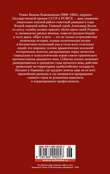 Роман известного советского писателя Вадима Кожевникова (1909–1984), лауреата Государственной премии СССР и РСФСР, — дань уважения смертельно опасной работе советской разведки в годы Второй мировой войны. Главный герой, Александр Белов, по долгу службы должен принять облик врага своей Родины и, ежеминутно рискуя жизнью, повести трудную борьбу в тылу врага. «Щит и меч» — это не только остросюжетная шпионская история, полная политических интриг и бесконечных испытаний ума и силы воли отдельных людей, это широкое, насыщенное драматическими коллизиями историческое полотно, раскрывающее перед читателем социальные и психологические корни самого трагического противостояния двадцатого века.