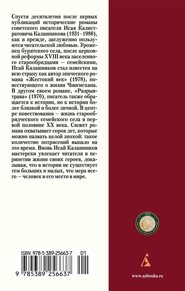 Спустя десятилетия после первых публикаций исторические романы советского писателя Исая Калистратовича Калашникова (1931–1980), как и прежде, заслуженно пользуются читательской любовью. Уроженец бурятского села, после церковной реформы XVIII века заселенного старообрядцами — семейскими, Исай Калашников стал известен на всю страну как автор эпического романа «Жестокий век» (1978), повествующего о жизни Чингисхана. В другом своем романе, «Разрыв-трава» (1970), писатель также обращается к истории, но к истории более близкой и более личной. В центре повествования — жизнь старообрядческого семейского села в первой половине XX века. Сюжет романа охватывает сорок лет, которые можно назвать целой эпохой: такое количество потрясений выпало на это время. Вновь Исай Калашников мастерски увлекает читателя в перипетии жизни своих героев, доказывая, что в истории не существует тем больших и малых, что мера всего — человек и его место в мире.