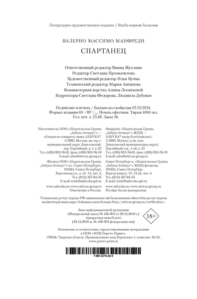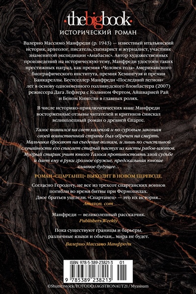 Валерио Массимо Манфреди (р. 1943) — известный итальянский историк, археолог, писатель, сценарист и журналист, участник знаменитой экспедиции «Анабасис». Автор художественных произведений на историческую тему, Манфреди удостоен таких престижных наград, как премия «Человек года» Американского биографического института, премия Хемингуэя и премия Банкареллы. Бестселлер Манфреди «Последний легион» лег в основу одноименного голливудского блокбастера (2007) режиссера Дага Лефлера с Колином Фертом, Айшварией Рай и Беном Кингсли в главных ролях. В числе историко-приключенческих книг Манфреди восторженные отзывы читателей и критиков снискал великолепный роман о Древней Спарте. Талос появился на свет калекой и по суровым законам своей воинственной страны был обречен на смерть. Мальчика бросают на съедение волкам, и лишь по счастливой случайности его спасает старый пастух из касты рабов-илотов. Мудрый старик учит юного Талоса противостоять злой судьбе и дает ему в руки грозное оружие, предсказывая юноше славное будущее... Роман «Спартанец» выходит в новом переводе.